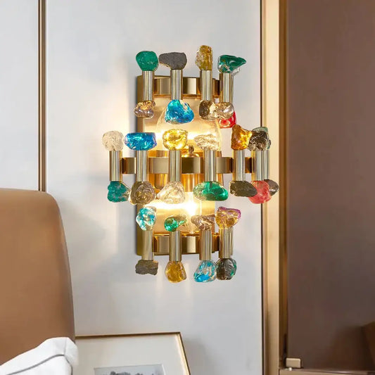 Luxuriöse Wandleuchte aus gebürstetem Gold mit buntem Kristallkristall für das Schlafzimmer