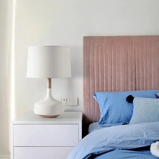 Nordische weiße Schreibtischlampe aus Holzstoff für Arbeitszimmer, Wohnzimmer, Schlafzimmer